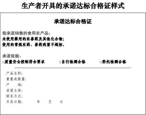 承诺达标合格证是指农产品生产企业、农民专业合作社、农户和从事农产品收购的单位或者个人,根据质量安全控制、检测结果等依法开具,承诺其销售的农产品未使用禁用农药、兽药及其他化合物且使用的常规农药、兽药残留不超标等的证明。