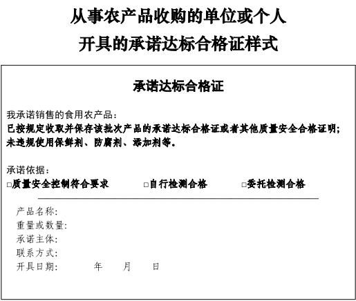承诺达标合格证应当包括承诺事项、承诺依据和产品名称、产品数量、产地、开具时间、承诺主体、联系方式等内容,可以采取信息化、印刷、手工填写等方式开具。包装销售的农产品以销售包装为单位附具,无包装销售的农产品以生产批次为单位附具。